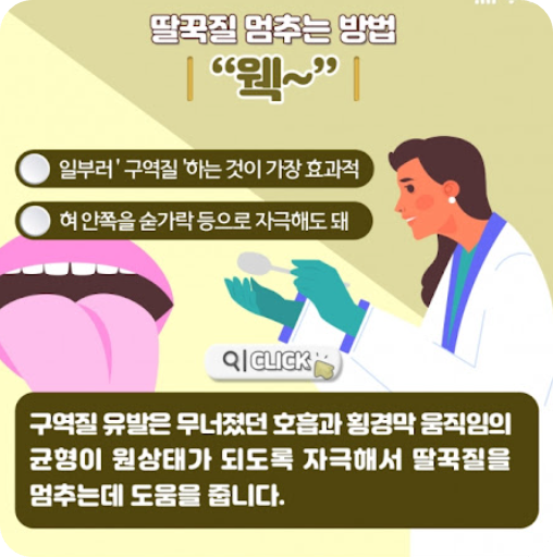 구역질이 일어나면 무너졌던 호흡과 횡격막 움직임의 균형이 원래 상태로 돌아가면서 딸꾹질이 멈추게 돼요. 방법은 깨끗한 숟가락이나 손가락으로 혀 뒤쪽을 살짝 눌러서 구역감을 유발하는 거예요.