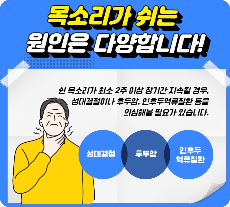 평소 목소리를 많이 사용하시는 교사나 가수분들은 더욱 주의 깊게 관찰하셔야 해요. 목소리 변화가 1년 이상 지속되더라도 양상이 급격히 변하지 않는다면 다른 질환일 가능성도 있으니, 정확한 진단을 위해 이비인후과 검진을 받아보시는 것이 좋겠어요.