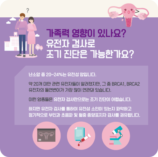 특히 40세 이후 여성분들은 1년에 한 번씩은 꼭 부인과 검진을 받아보시길 바라요. 가족력이 있으시다면 더욱 주의 깊게 관찰하셔야 하고, 유전자 검사도 고려해볼 수 있어요.