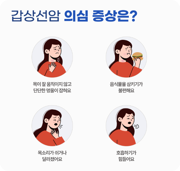 갑상선암에 의해 기도가 눌리면 평상시에는 괜찮다가도 몸을 움직일 때나 감기에 걸리면 증상이 두드러질 수 있습니다. 호흡 곤란은 생명을 위협할 수 있는 중요한 신호이므로 절대 가볍게 넘어가서는 안 됩니다.