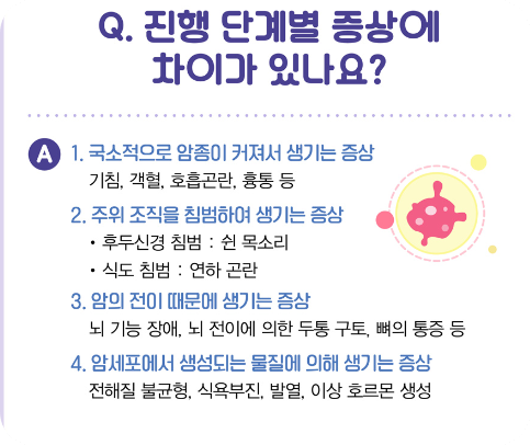 통증의 양상은 다양해서 날카롭게 찌르는 듯한 느낌일 수도 있고, 압박하는 듯한 느낌일 수도 있답니다. 또 폐암이 직접 흉벽을 침범하지 않더라도 갈비뼈로 전이되어 통증이 생기기도 해요. 가슴 통증이 있을 때는 종양이 있는 쪽과 같은 방향에서 통증이 느껴지는 경우가 많아요.