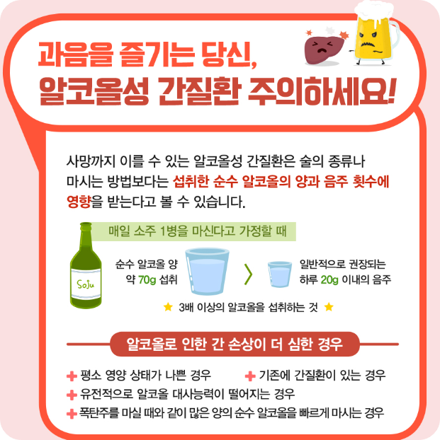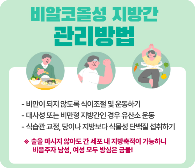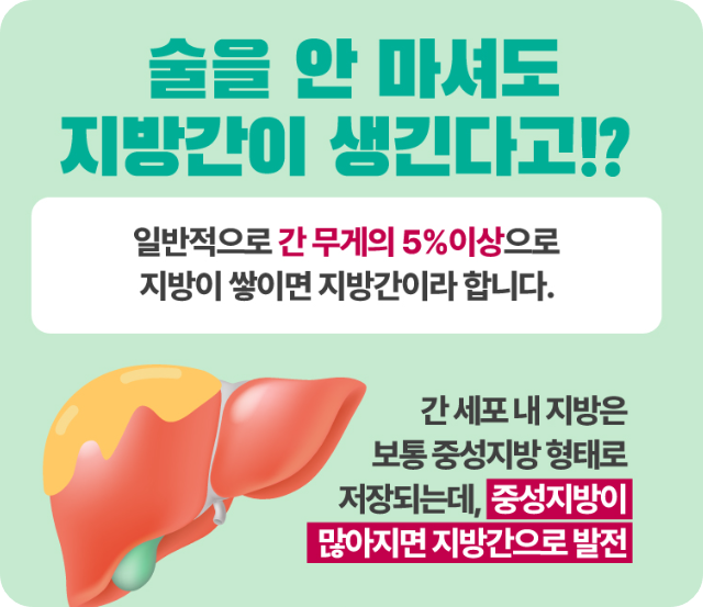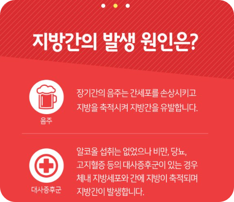 술은 간에서 지방 합성을 촉진하고 간세포를 파괴할 수 있어서 지방간의 주요 원인 중 하나예요. 알코올성 지방간의 경우 금주만 해도 정상으로 회복될 수 있답니다.