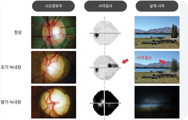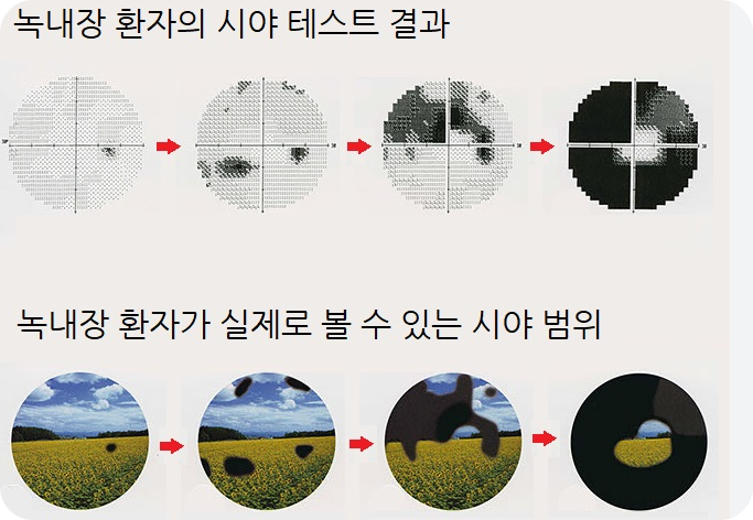 녹내장의 가장 특징적인 증상은 주변부 시야부터 서서히 좁아지는 거예요. 처음에는 주변부의 일부분이 보이지 않게 되지만 하루하루 변화가 적고 두 눈이 상호보완 작용을 하기 때문에 본인이 알아차리기가 정말 어렵답니다.