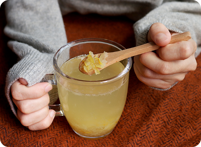 생강은 몸을 따뜻하게 해주는 성질이 있어서 체온을 올려주고 면역력을 높이는 데에도 도움을 주는데요. 냉증이 있거나 손발이 차가운 분들에게도 좋습니다. 위의 기능을 열어서 소화를 돕는 효능도 있어서 소화불량이 있을 때도 좋답니다.