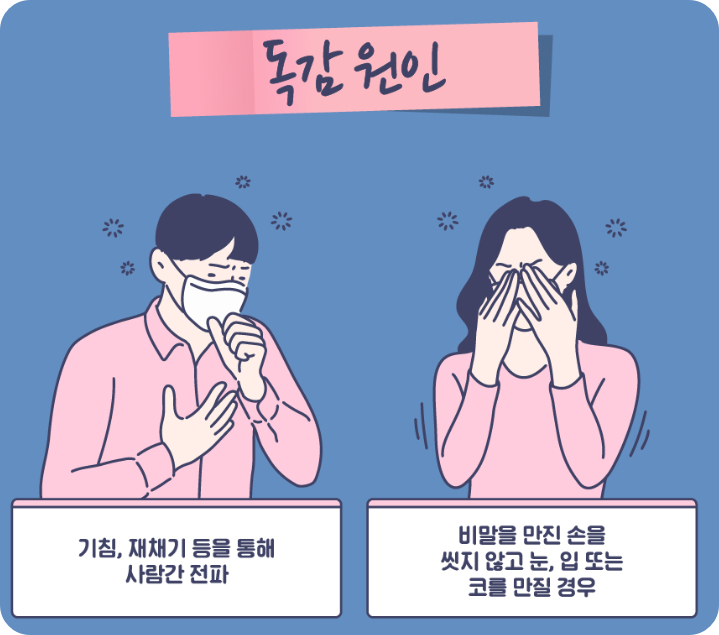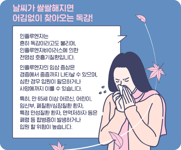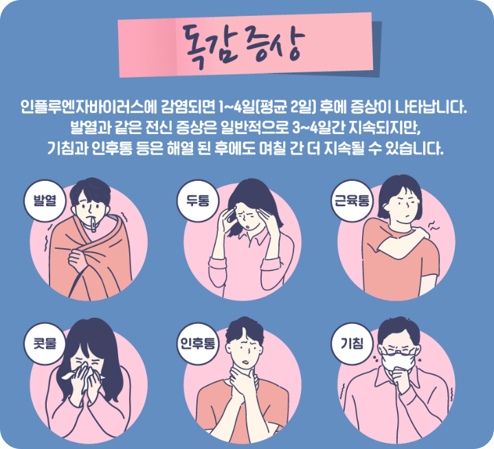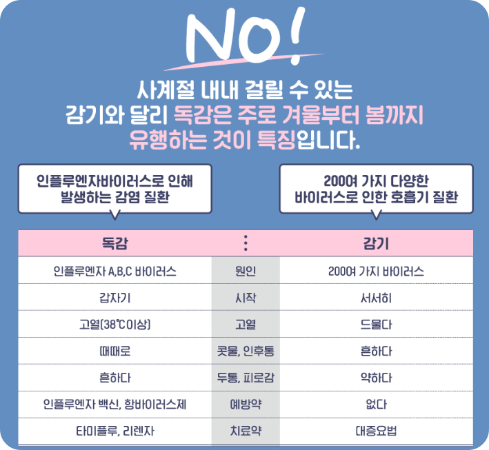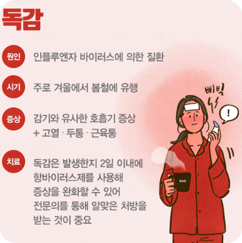 감기는 서서히 증상이 나타나면서 콧물이나 코막힘 같은 호흡기 증상이 주로 나타나지만, 독감은 갑자기 시작되면서 38도 이상의 높은 열과 온몸이 아픈 전신 증상이 함께 나타난다는 점이 다르답니다.