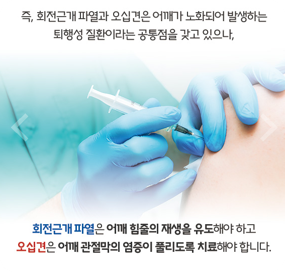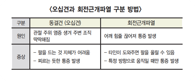 주요 증상은 어깨를 들어 올릴 때 통증이 나타나고 야간 통증이 흔히 발생하는 것인데, 오십견과 다른 점은 어깨 위쪽으로 팔을 움직이는 것을 제외하면 통증을 크게 느끼지 않는다는 거예요.