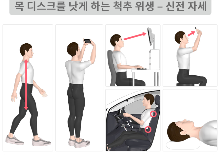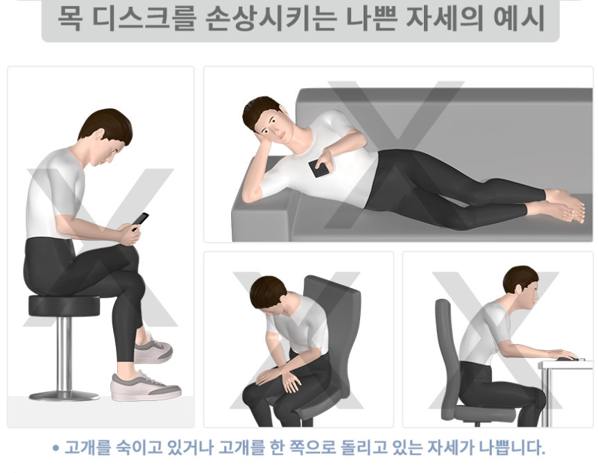 목을 젖히면 디스크가 더 밀려나와 신경을 강하게 압박하기 때문에 증상이 악화되는 거예요. 또한 목을 움직이는 동작에 따라 통증이 변화하는 것도 목디스크의 특징인데요, 특정 자세에서만 통증이 심해진다면 반드시 검사를 받아보셔야 해요.