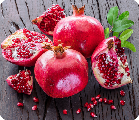 석류에 함유된 엘라지타닌 성분은 에스트로겐 분비량을 과하지도 부족하지도 않게 조절해 주는 역할을 해요. 폴리페놀과 안토시아닌 같은 항산화 성분도 매우 풍부해서 항노화 작용을 하고, 칼슘과 엽산도 다른 과일에 비해 월등히 많이 들어있답니다.