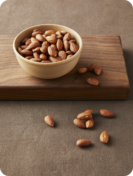 아몬드에는 칼슘, 인, 마그네슘 같은 무기질이 풍부하게 함유되어 있어서 뼈를 튼튼하게 만들고 골다공증을 예방하는 데 큰 도움이 돼요. 아몬드 100g에는 단백질이 21.26g이나 들어있어서 닭가슴살보다도 단백질 함량이 높답니다.
