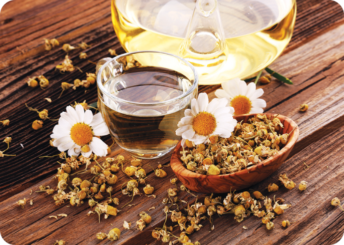 캐모마일차는 피부 노화를 늦추고 피부 건강을 개선하는 데 정말 좋아요. 아피게닌이라는 항산화 성분이 몸이 산성이 되는 것을 억제시켜주기 때문에 피부 노화의 속도를 더디게 해주는 효과가 있거든요.