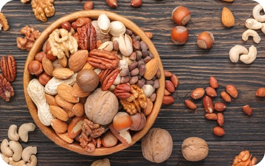 호두, 아몬드, 캐슈넛 같은 견과류는 좋은 지방과 단백질, 그리고 마그네슘, 아연, 비타민 E 같은 영양소가 풍부해요. 특히 비타민 E는 강한 항산화 작용으로 세포 손상을 줄여주며, 몸의 면역 반응을 지켜줍니다.