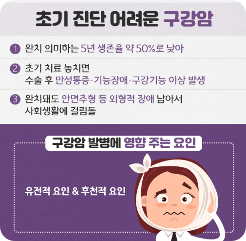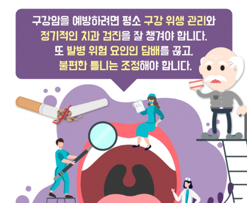 턱이 붓거나, 목소리가 변하거나, 입이나 혀가 마비되는 증상이 함께 나타날 수도 있어요. 목 부위의 임파선으로 전이가 의심되는 경우에는 구강 내의 암 조직뿐만 아니라 목 부위의 임파조직도 모두 절제해야 하기 때문에, 조기 발견이 매우 중요해요.