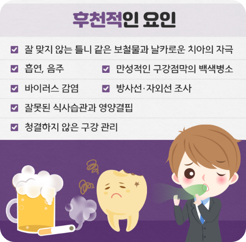 설암으로 인한 출혈은 구내염과 비교했을 때 병변의 범위가 넓고 출혈과 통증이 계속 이어지는 특징이 있어요. 입이나 목구멍에서 반복적으로 출혈이 발생한다면 구강암을 의심해볼 수 있어요.