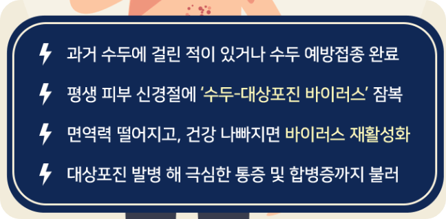 대상포진 증상에 대해 자세하게 알아보겠습니다. 대상포진은 어렸을 때 수두를 앓았던 분들이라면 누구나 걸릴 수 있는 질환인데요. 수두 바이러스가 몸속에 잠복해 있다가 면역력이 약해지면 다시 활동을 시작하면서 발생하게 되죠.