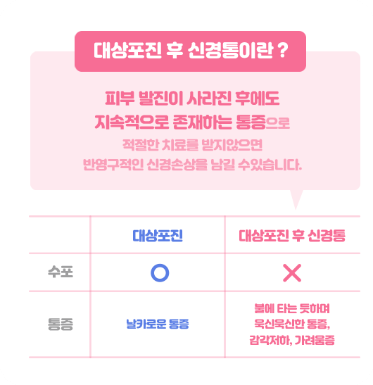 대상포진은 신경을 공격하는 질환이기 때문에 다양한 감각 이상이 나타날 수 있어요. 해당 부위가 무감각해지거나 반대로 과도하게 예민해지는 현상이 생기기도 하고, 개미가 기어가는 듯한 이상한 느낌이 들기도 해요.