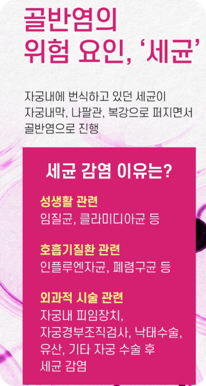 골반염 증상에 대해 알아보겠습니다. 골반염은 자궁내경관에 있던 세균이 자궁내막과 나팔관, 복강까지 퍼지면서 염증을 일으키는 질환인데요, 질염이나 자궁경부염을 제때 치료하지 않고 방치하면 골반염으로 발전할 수 있어요.