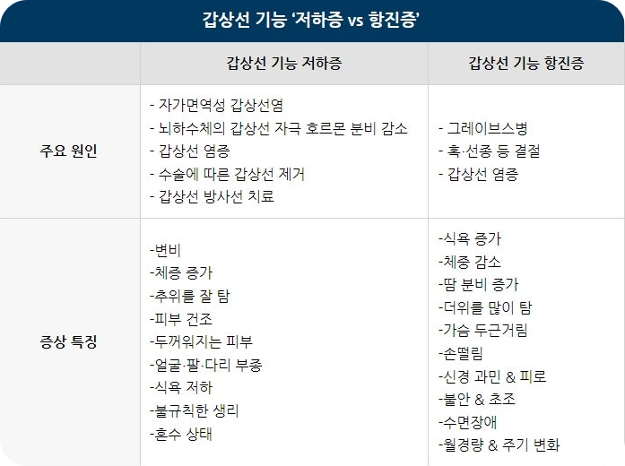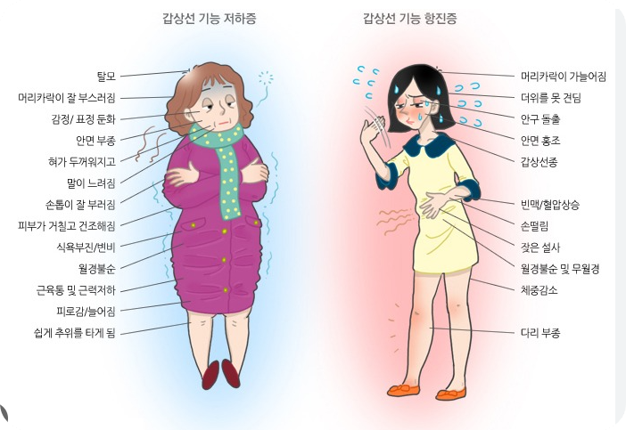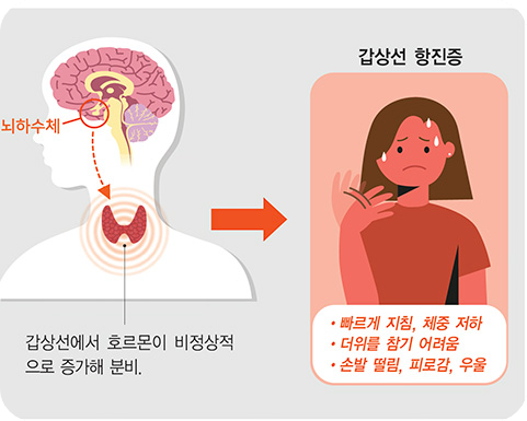 갑상선 호르몬이 과다하게 분비되면 체내 대사율이 증가하면서 열 발생이 많아져요. 그래서 다른 사람들은 괜찮은데 본인만 유독 더위를 참기 어렵고 땀을 많이 흘리게 되는 거죠.