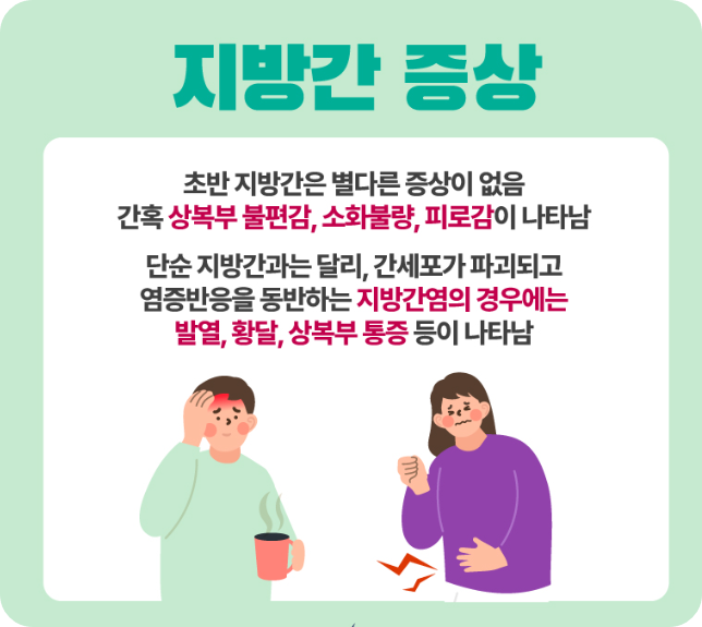 대부분 건강검진에서 간 수치 이상이나 복부 초음파 검사를 통해 알게 되는 경우가 많은데, 우리 몸이 보내는 신호들을 미리 알아두면 더 빠르게 대처할 수 있겠죠?