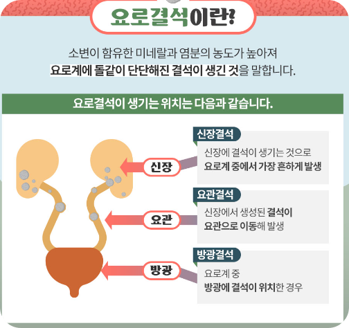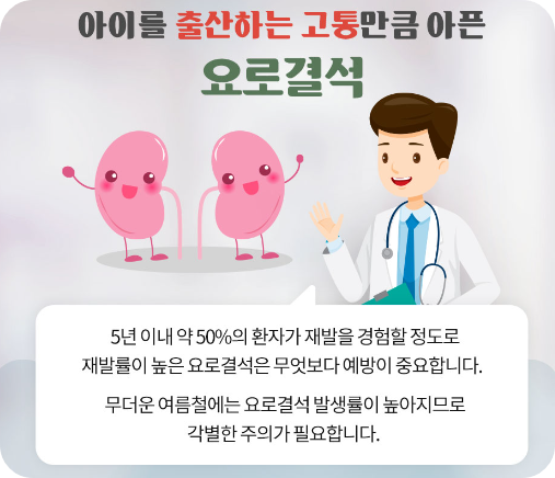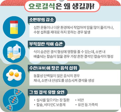 특히 여름철에는 땀을 많이 흘리면서 탈수가 되기 쉬워 더욱 위험해요. 또한 동물성 단백질을 너무 많이 섭취하거나, 비만, 운동부족, 스트레스, 음주와 흡연 등도 요로결석 발생의 위험요인이 된답니다. 유전적 요인도 있어서 가족력이 있다면 더욱 주의하셔야 해요.